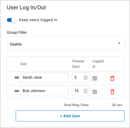 Enter your group users, their ring timeout settings, and specify whether they can log in or out of the group by dialing a star code.